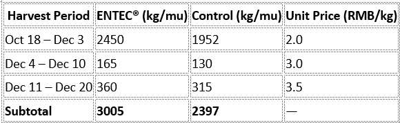During the same period, cucumber income increased by RMB 1,443.5/mu with ENTEC®.