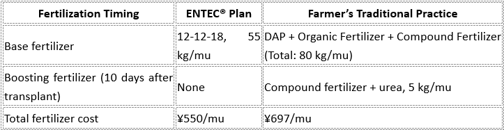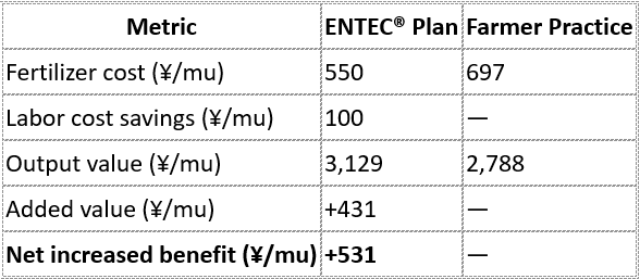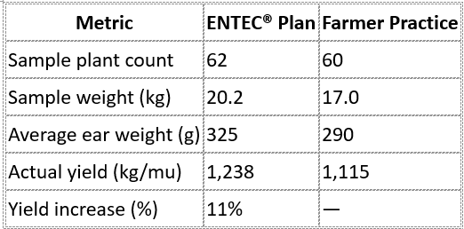 The ENTEC® advantage lies in significantly increasing single-ear weight while using less fertilizer. Compared to traditional practice, ENTEC® improved fertilizer use efficiency and reduced application frequency. Studies confirm that better fertilization enhances agronomic traits such as: