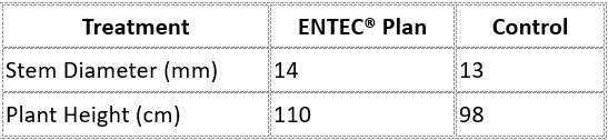 The ENTEC® treatment clearly promoted better plant development. Compared to the control, ENTEC® increased stem diameter by 8% and plant height by 12%, with earlier canopy closure and visibly more vigorous growth.