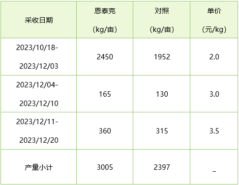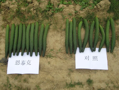 根据地头收购价格,12月3日前为2.0元/kg,4-10日为3.0元/kg,11-20日为3.5元/kg,这三个时期恩泰克®推荐的黄瓜销售收入每亩分别比对照多1245元,105元和93.5元,累计增加收入1443.5元/亩。