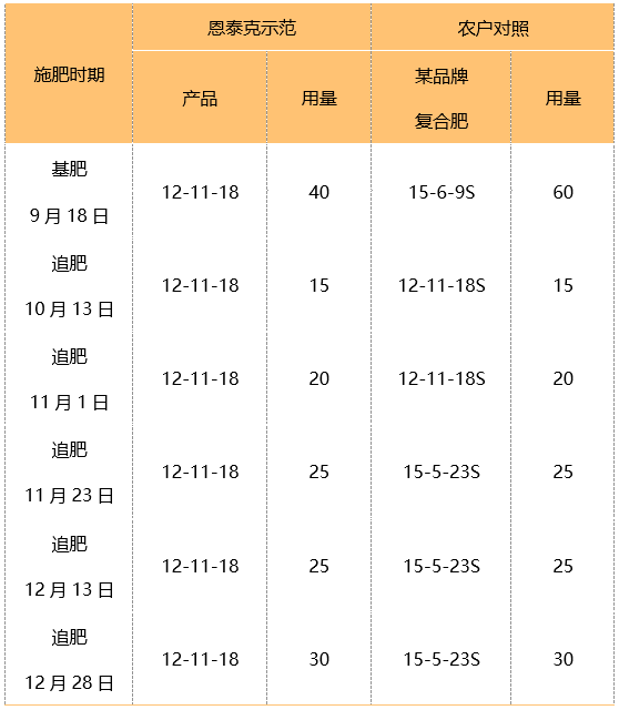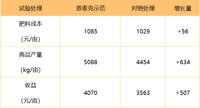 3.恩泰克®示范区肥料成本增加56元/亩,产量增加634kg/亩,经济收益增加507元/亩。